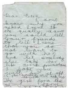 Une semaine avant le bal, Jennifer m’a envoyé une lettre. Elle ne comprenait pas pourquoi je ne lui avais pas demandé d’être ma cavalière et suggérait que mon ami Derek me remplace auprès d’Irene. Malheureusement, je ne pouvais plus faire marche arrière. J’ai gardé sa lettre signée : « La fille de la ferme ». Et je regrette encore la peine que je lui ai causée.