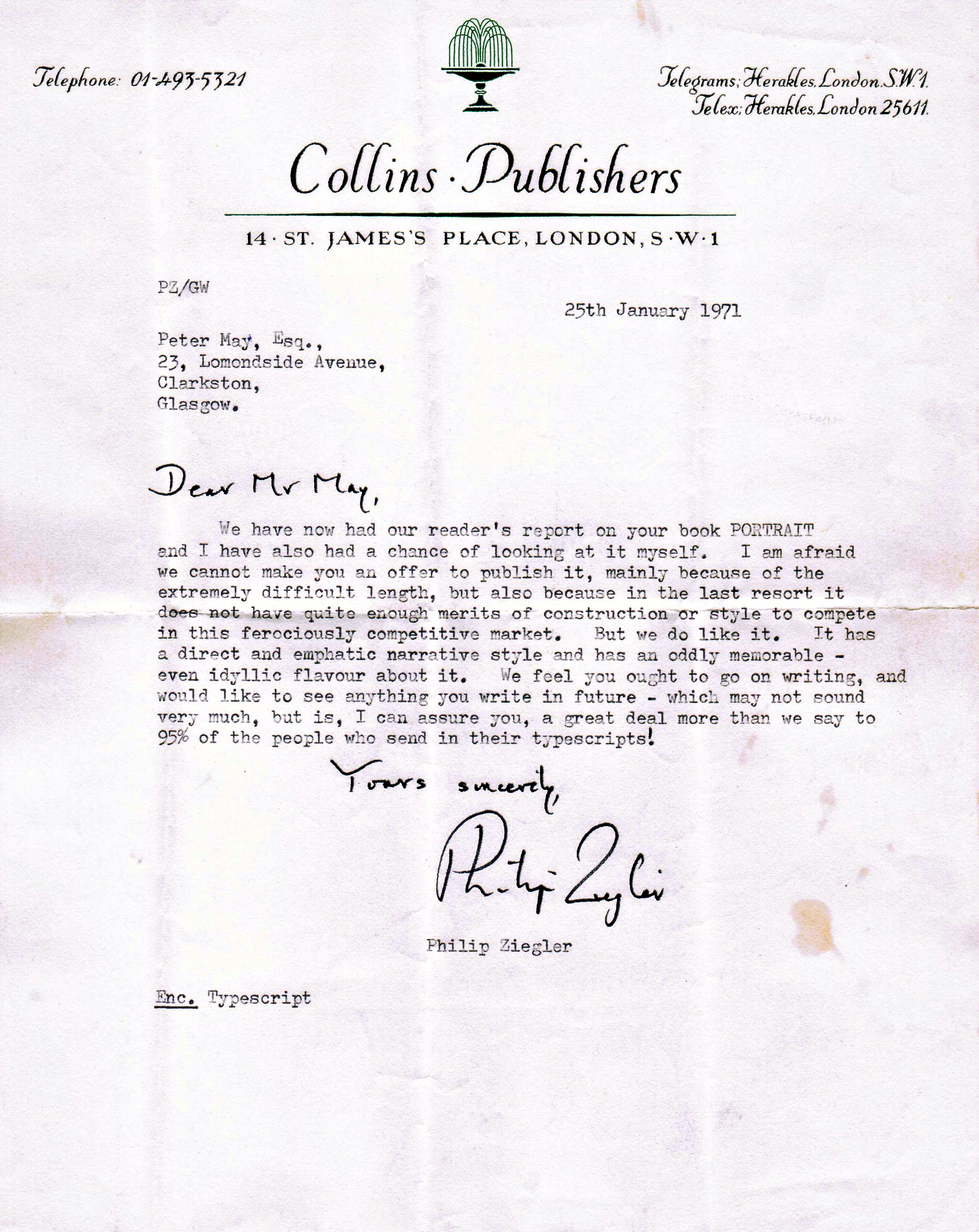 “Portrait” was different. It was a story of youthful love, disillusion and eventual tragedy. I was cutting my real writer’s teeth. And it was my first step on a long and difficult road that would be full of frustration and rejection. It was short, only about 25,000 words – not a commercially viable length – so my expectations were not high. All the same, I was excited when a letter from Collins Publishers finally dropped through the letterbox.